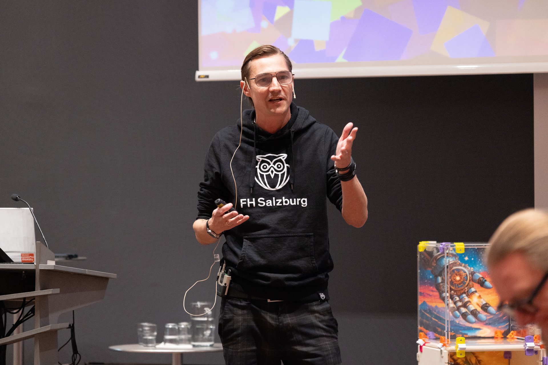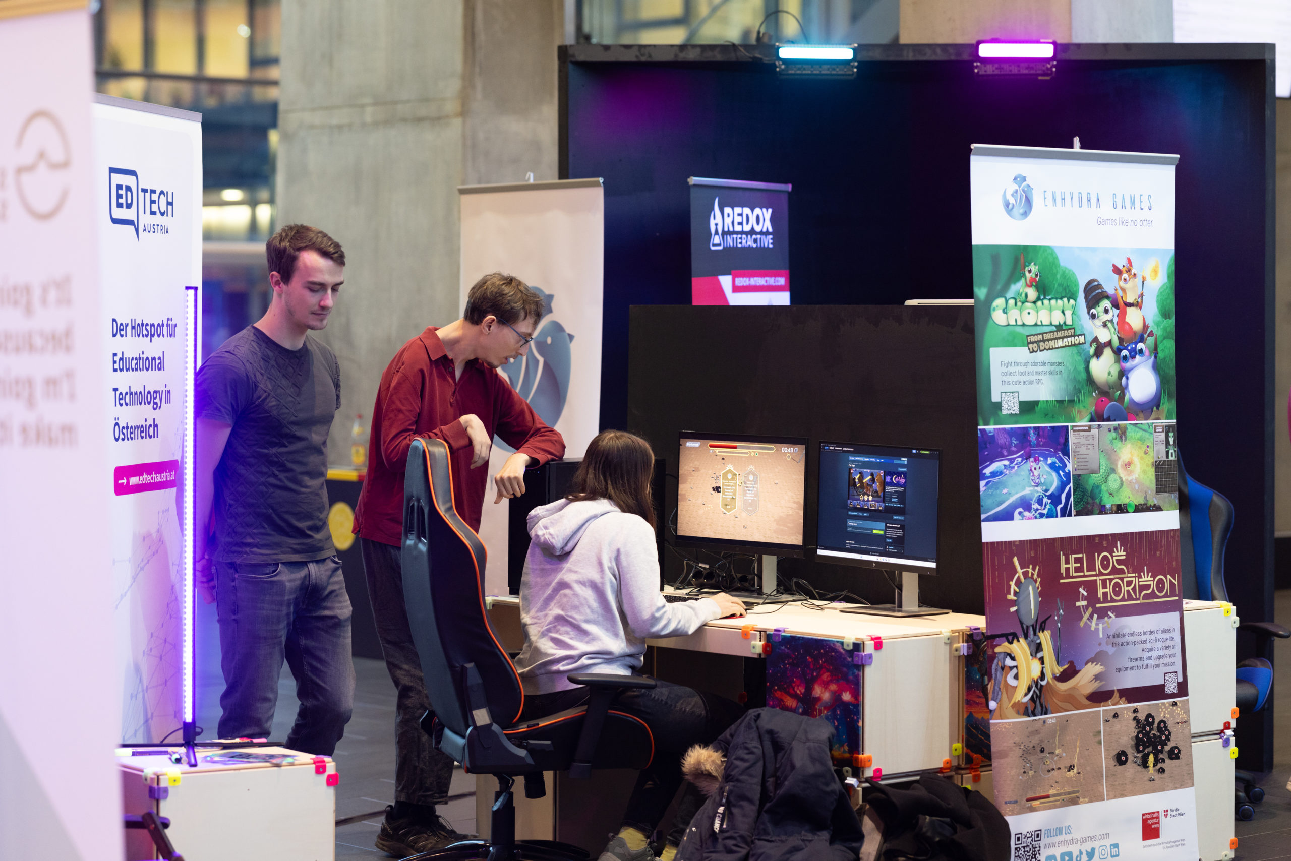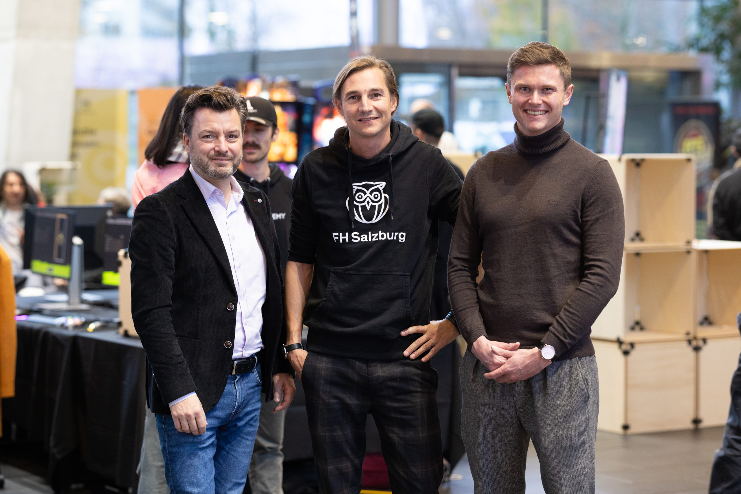 Das Event begann mit dem Pixel Playground im Foyer der FH Salzburg. Diese interaktive Ausstellung bot den Teilnehmer:innen die Möglichkeit, die Spiele der FH Salzburg Studierenden und Absolvent:innen zu testen sowie Entwicklungen im Bereich der digitalen Medien und Spieleentwicklung hautnah zu erleben.